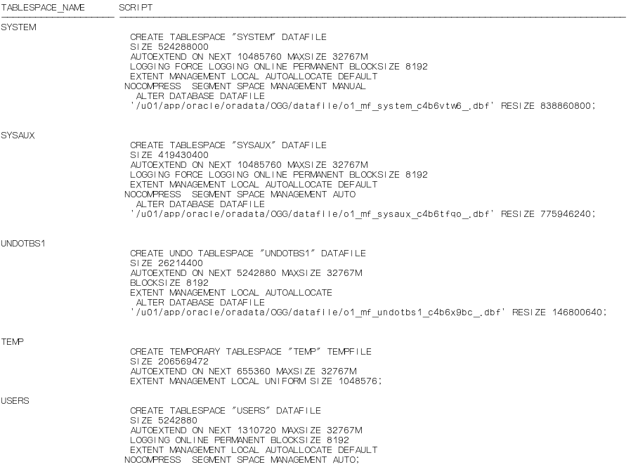select tablespace_name, dbms_metadata.get_ddl(‘TABLESPACE’,tablespace_name)||’;’ script