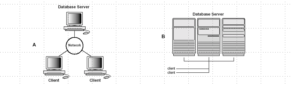 아래 그림A는 Client와 Server가 다른장비에 위치하고 이 장비들이 네트웍을 통해 연결되어 있는 형태를 나타냅니다. 이때, Client와 Server는 Oracle Net 서비스를 통해 통신하게 됩니다. 그림B는 하나의 장비가 하나 이상의 프로세서를 가지고 있고, 이 프로세서들은 오라클 Application의 수행을 분산처리 하게 됩니다.