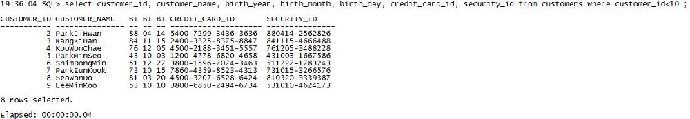 select customer_id, customer_name, birth_year, birth_month, birth_day, credit_card_id, security_id from bmt.customers where customer_id < 10 ;