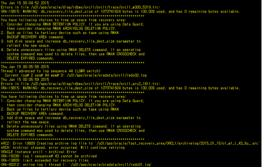 ARC2: Error 19809 Creating archive log file to ‘/u01/app/oracle/fast_recovery_area/ORCL1/archivelog/2015_01_15/o1_mf_1_43_%u_.arc’