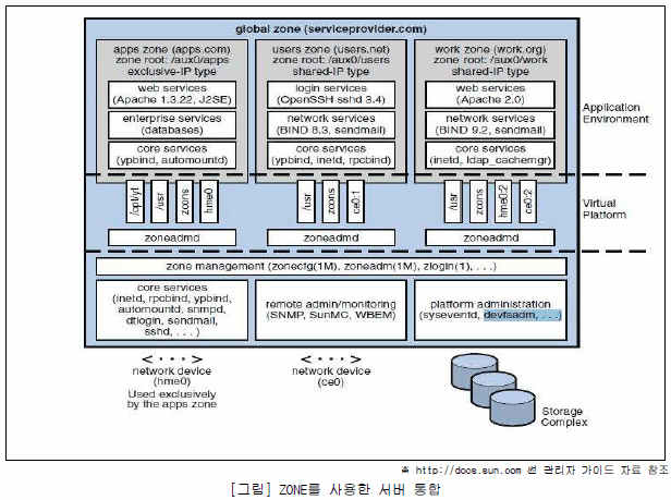 A zone provides isolation at almost any level of granularity you require. A zone does not need a dedicated CPU, a physical device, or a portion of physical memory. These resources can either be multiplexed across a number of zones running within a single domain or system, or